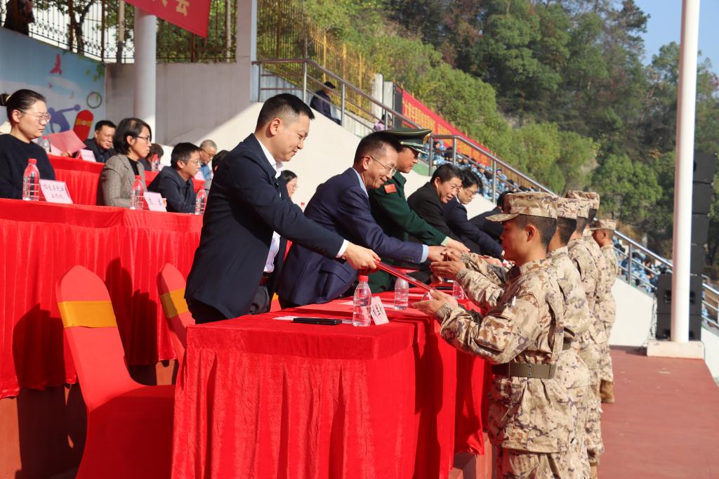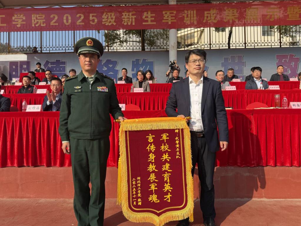 表演结束后,校长胡国珍向承训部队武警黄石支队赠送锦旗。校领导为新生军事训练优胜单位、优秀教官、优秀辅导员、优秀学员颁奖。冯运仿宣读2025级新生军训表扬文件。