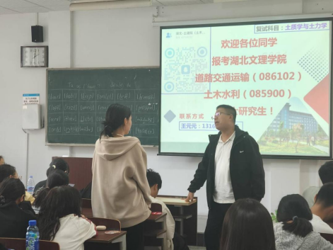 10月14日,湖北文理学院土木工程与建筑学院院长李业学、教学委员会副主任尹晓萌、道路桥梁工程系党总支书记周兴涛、学工办张萍一行四人来到我院,于J3-101教室举办研究生招生宣讲会,吸引2022级、2023级百余名学生积极参与。宣讲会由周兴涛书记主讲,他首先介绍了湖北文理学院的办学定位与整体特色,随后以“学科优势与培养特色”为主题,重点展示了该院土木工程与建筑学院的师资配置、重点实验室建设以及特色研究方向,结合具体学术成果生动呈现了学院的科研氛围与学科竞争力。在报考政策环节,周书记围绕2025年硕士研究生招生计划、报考条件及奖学金政策等内容进行了细致说明,帮助同学们把握关键报考信息。互动环节中,学生们踊跃提问,就毕业生就业率与就业质量、历年录取分数等热点问题与宣讲老师深入交流,现场气氛热烈。