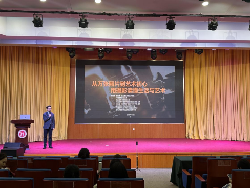 邹定家老师通过大屏幕展示了自己多年来拍摄的精彩作品:有海拔7556米的雪峰日落,有深藏在沙漠腹地的红色水景,有祖国各族人民的时代剪影,也有大家熟悉的校园风光,每一张照片都展示了他对自然对社会对当下时代的解读,通过真实经历与影像故事,引导同学们感受摄影背后的生活温度与艺术价值。