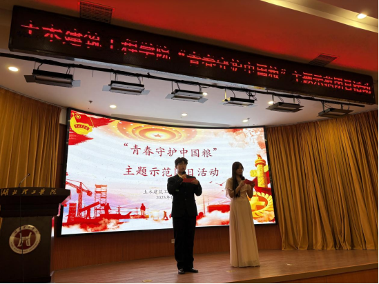 土木建筑工程学院党总支部副书记吴佳伟致辞,他强调粮食安全是国家安全的重要基石,作为土木专业学子,可在粮食仓储设施建设、农业工程规划等领域贡献专业力量,以实际行动诠释“守护中国粮”的青年担当。