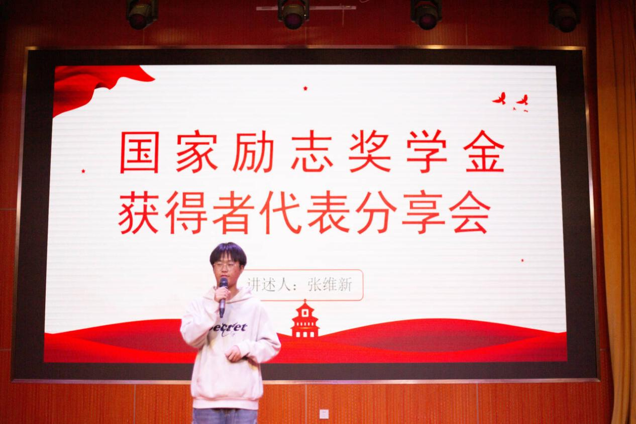分享会上,国家励志奖学金获得者代表张维新以“新的环境,新的挑战,新的开始”开篇,强调“机会不光留给有准备的人,更留给勇敢解决问题、敢于克服困难的人”,鼓励同学们在大学新征程中主动出击、直面挑战。他以“小米舆论事件”为例,生动阐释信息爆炸时代,学子须具备理性判断、追本溯源的思维能力,这既是专业学习的底层逻辑,也是个人成长的核心素养。