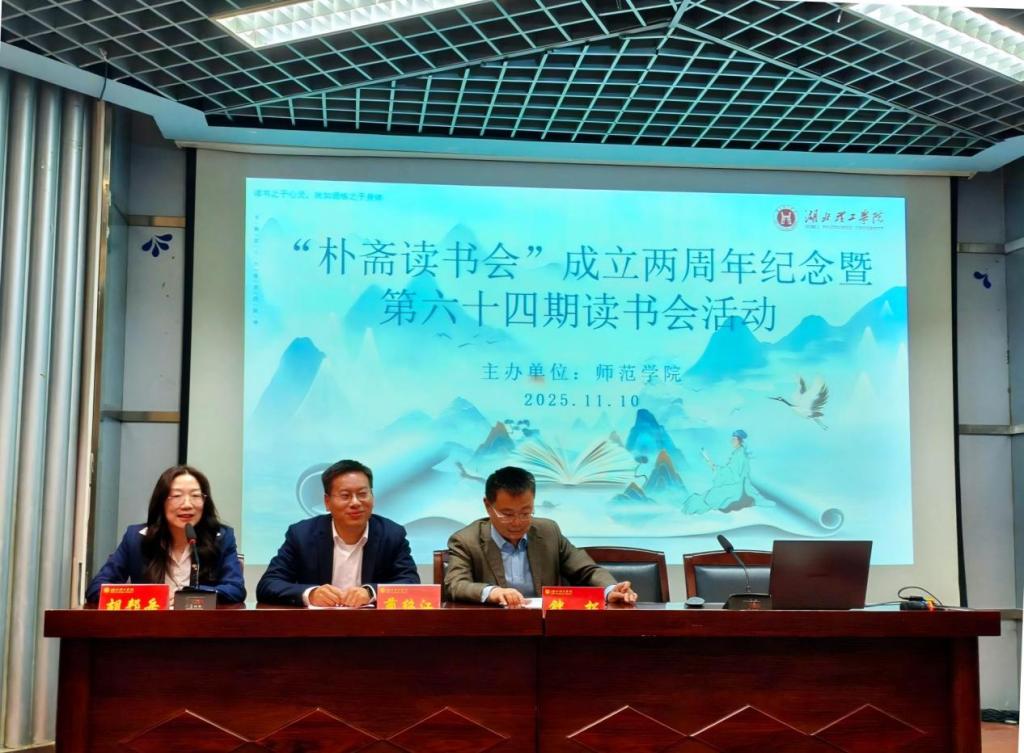 本网消息 11月10日下午,师范学院“朴斋读书会”成立两周年纪念暨第六十四期读书会活动在图书馆T2报告厅隆重举行。师范学院院长胡邦岳教授主持活动,学校教务处处长蔺绍江、图书馆馆长钟松,读书会指导老师朱克理博士、刘会龙博士、唐思语博士,师范学院相关教师及全体读书会会员齐聚一堂,共襄盛典。本次活动还特邀湖北省特级教师金凯作专题讲座,共同见证朴斋读书会两年来深耕经典、立德树人的丰硕成果。
