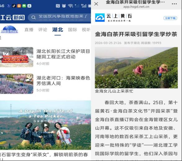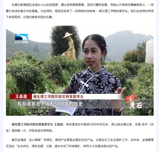 本网消息 近日,我校组织留学生开展了“读懂中国·魅力黄石”系列文化体验及社会实践活动。从西塞山河口镇漫山遍野的金色油菜花海,到阳新县金海万亩茶园里沁人心脾的茶香,留学生们以“文化使者”的独特视角,用眼睛观察、用双手触摸、用心灵感受,生动地展现出黄石在乡村振兴、文化传承与城市发展中的崭新面貌。此次活动先后获得学习强国、湖北电视台、黄石日报、东楚晚报等多家主流媒体报道,相关图文报道及视频同步发布在海外社交媒体“Discover Huangshi”外宣版块,实现海内外双线传播,引发广泛社会关注与热烈反响。