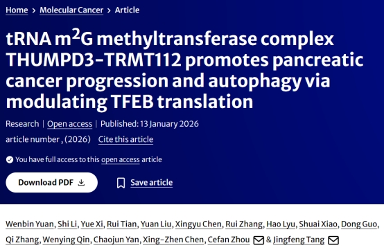 本网消息 近日,医学院袁文彬博士团队以第一作者身份在国际顶尖癌症期刊Molecular Cancer(IF=33.9)发表了题为“m2G tRNA methyltransferase complex THUMPD3-TRMT112 promotes pancreatic cancer progression and autophagy via modulating TFEB translation”的研究论文,湖北工业大学唐景峰教授、周策凡教授为论文的共同通讯作者。